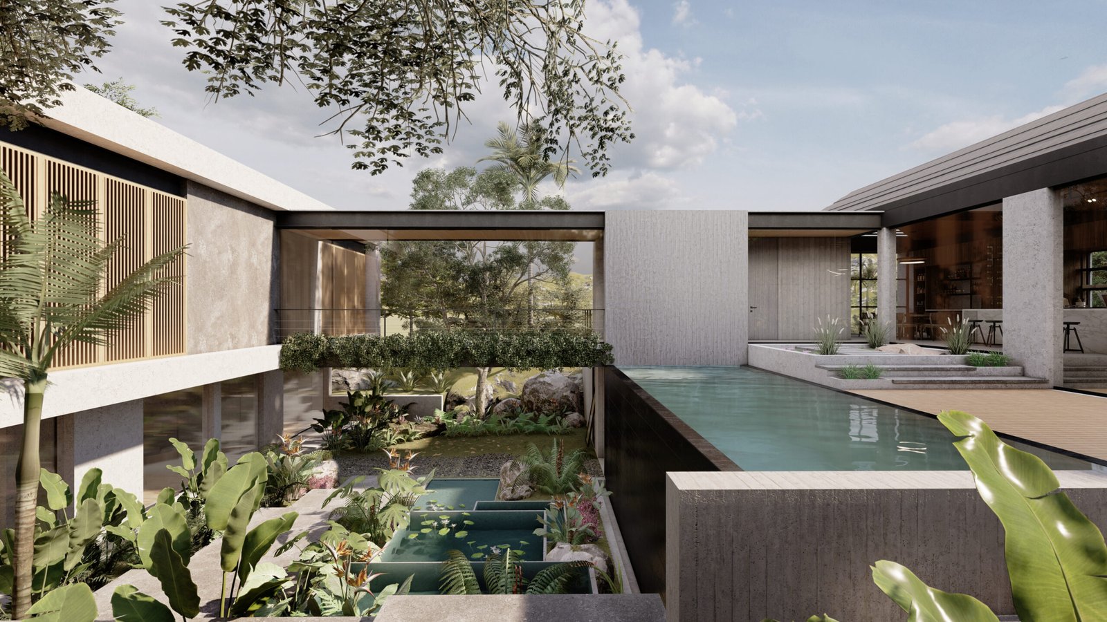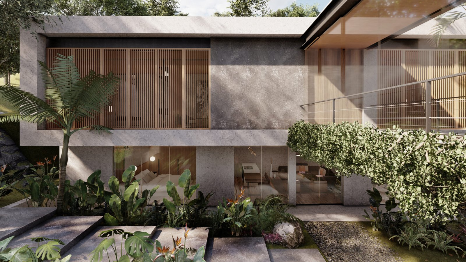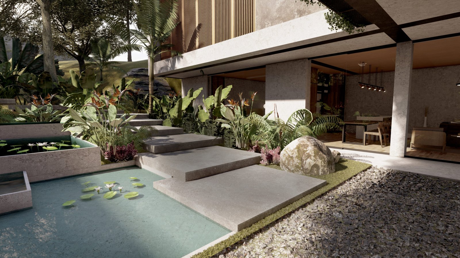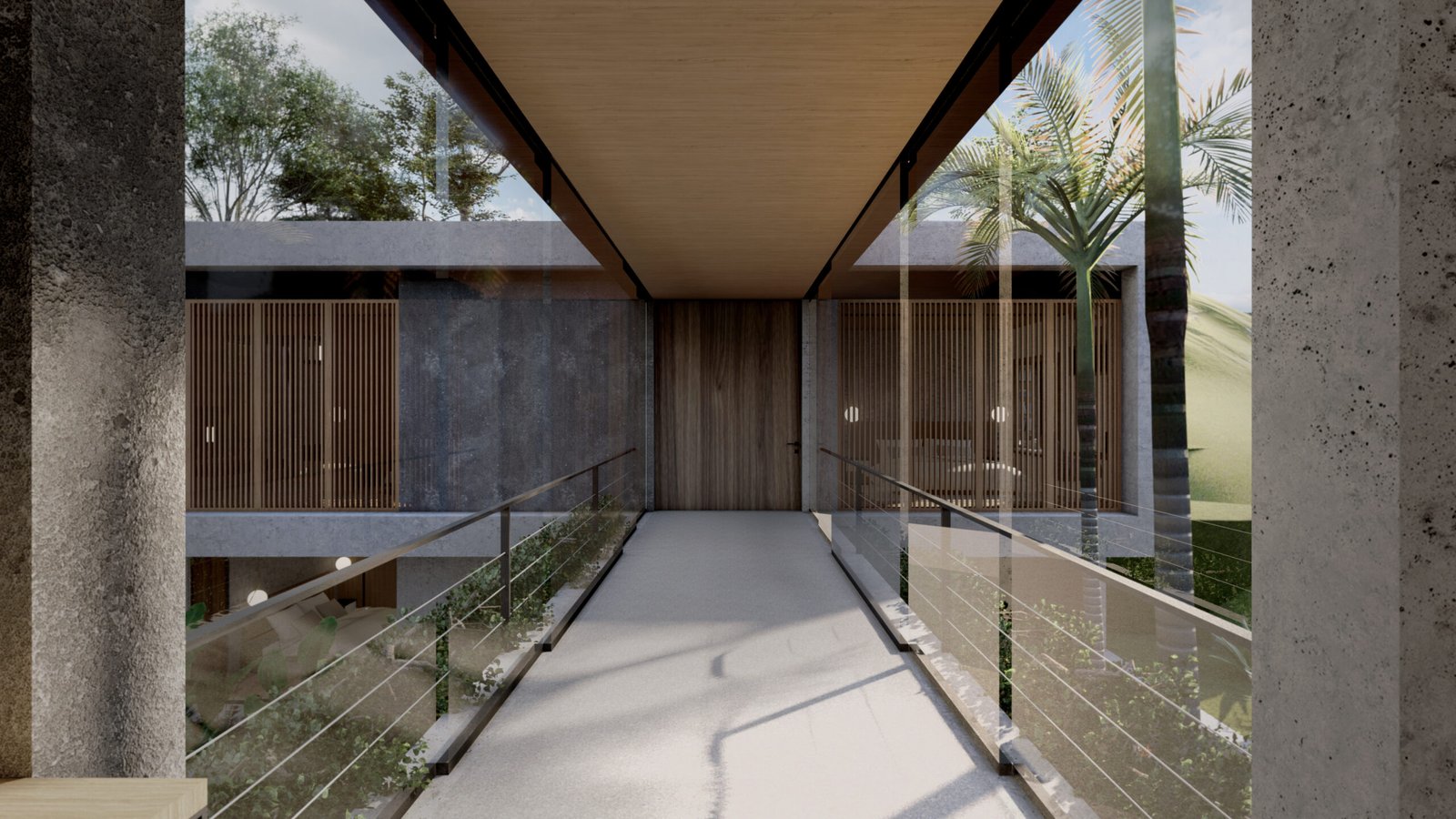 La casa puente se convierte en la conexión de la familia con su contexto y con su mundo interior, se plantean dos volúmenes, el primero donde se desarrolla toda el área social y servicios, en el segundo volumen se encuentran las habitaciones y espacios más privados, ambos volúmenes miran hacia un bosque central donde fluye el agua y la naturaleza y se le da el protagonismo necesario a las fachadas internas de ambos volúmenes estos a su vez se conectan a través de un puente que no solo es el alma de la casa si no un espacio de convivencia y estar.